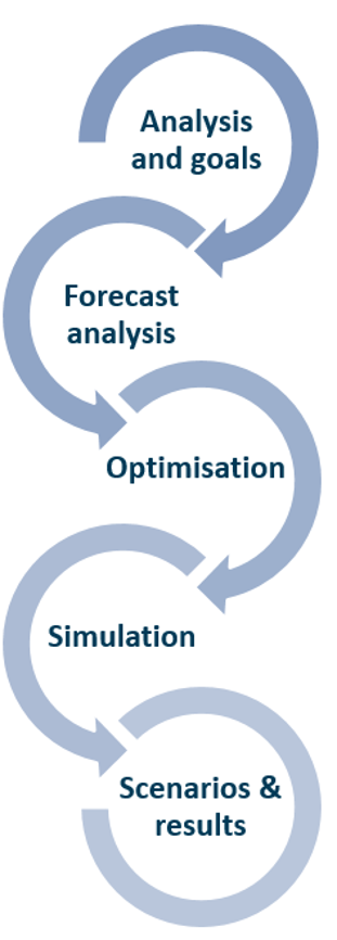 Generation of 10,000 forecast paths for yield development of individual asset classes, taking into account skewed distributions of returns, interest rate jumps, etc. Consideration of alternative interest rate scenarios according to agreement. Simulation of the portfolios presented into the future with simultaneous calculation of the resulting changes in the balance sheet ratios (coverage ratio, equity, net interest rate, etc.).