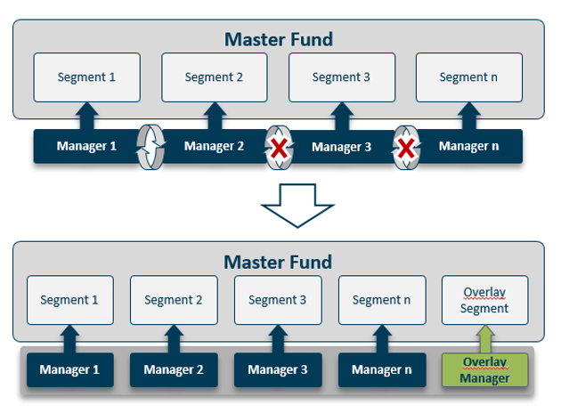 In a master fund structure with several segment managers, value protection is ensured by a risk overlay. This enables comprehensive and coordinated hedging of the overall mandate without the need for a direct sale of the assets of the relevant managers.