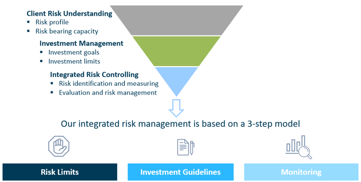 With integrated risk steering, the risk is managed directly in the portfolio. In the first step, we work with our clients to define an individual risk profile with the desired risk-bearing capacity. The investment objectives and limits are then agreed with the portfolio management team. Integrated risk management involves measuring and identifying the risks in the portfolio. If there is an increased risk appetite in the mandate, active risk reduction measures are initiated in collaboration with the portfolio management team.