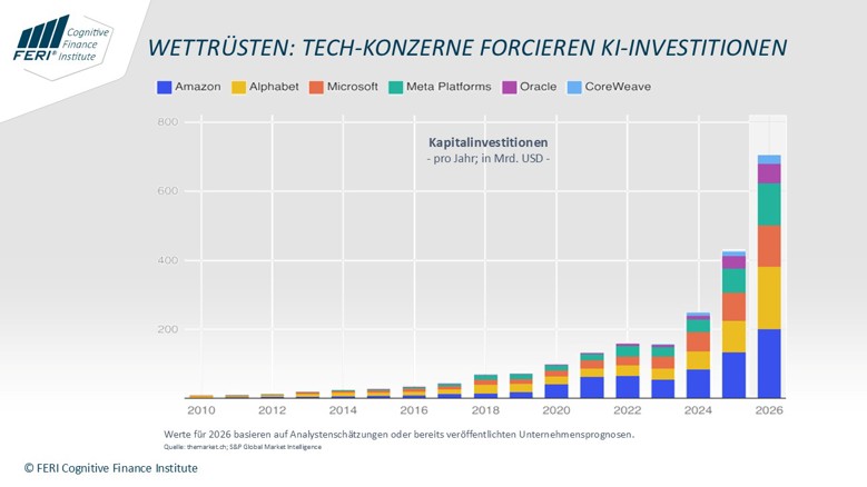 Für das Jahr 2026 planen die großen Tech Konzerne in den USA nahezu 700 Mrd. US Dollar an Kapitalinvestitionen – deutlich mehr als noch im Herbst 2025 prognostiziert. Der Schwerpunkt dieser Ausgaben liegt auf KI‑Infrastruktur, Rechenzentren und spezialisierten Chips. An der Spitze stehen Amazon mit 200 Mrd. US Dollar sowie Alphabet mit 175 bis 185 Mrd. US Dollar.