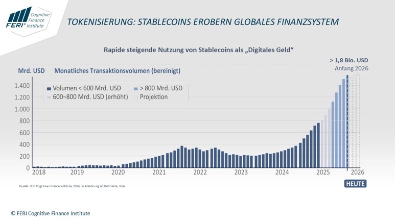 Über 1,8 Billionen US‑Dollar monatliches Transaktionsvolumen markieren einen signifikanten Trend: Stablecoins verbinden Tokenisierung, Geldpolitik und Geopolitik auf neue Weise – und werden so zu einem grundlegend neuen Baustein des Finanzsystems.